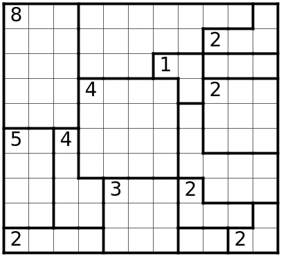 This is a Hinge puzzle. Shade some cells to form blocks connected by sides. Each block is contained in exactly two regions. Each block is mirror symmetric, and the axis of symmetry goes over the region border. Clues in some of the regions count the shaded cells in that region. Play online . I might have overdone the thinking in symmetry bit.